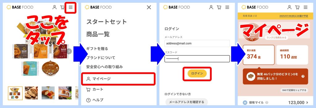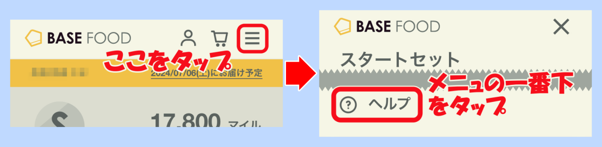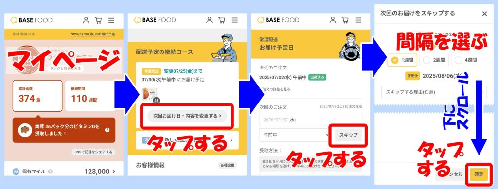ベースブレッドのスキップは、マイページから「次回お届け日・内容を変更」→「スキップ」で簡単にできます。