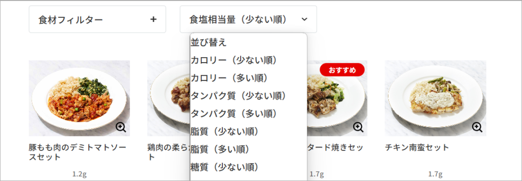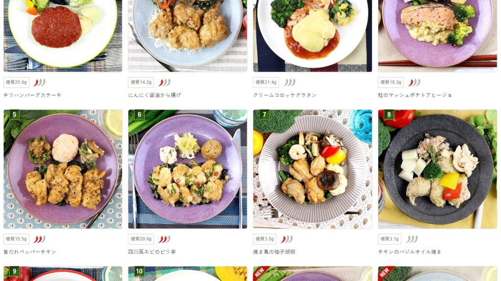- カロリー・糖質・脂質・タンパク質・塩分・食物繊維それぞれの栄養素について、多いものから少ないものまで幅広く選べるメニュー構成になっています