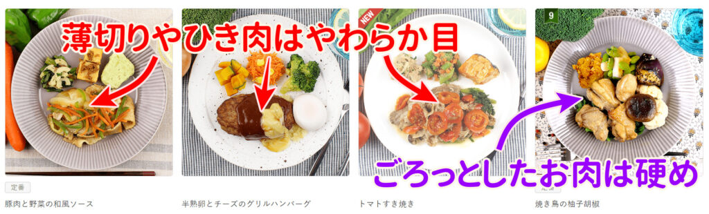 から揚げや照り焼きなどカットが大きめのお肉は歯ごたえがありそうですが、