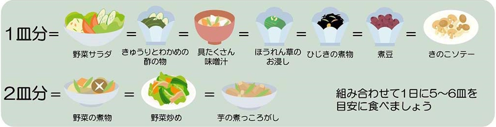 かんたんに言うと、1食ごとに野菜の小鉢を1皿以上食べると良いらしいです。(出典:e-ヘルスネット厚労省)